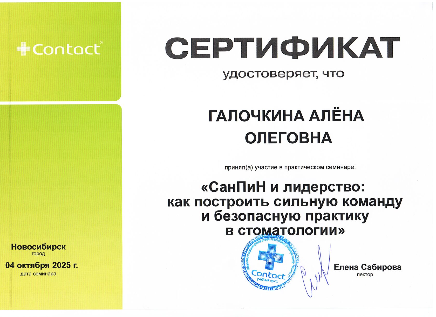 Галочкина Алена Олеговна, старшая медсестра, прошла обучение на семинаре "СанПин и лидерство как построить сильную команду и безопасную практику в Стоматологии